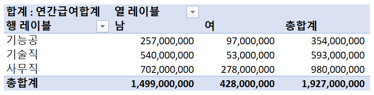이번에 예제로 나룰 내용은 어느 회사의 직군별 성별 연봉 합계를 구하는 것이다.