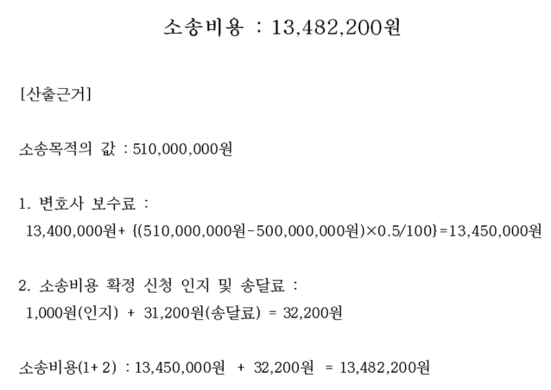 : 첨부한 '소송비용확정신청(예).doc'파일을 참고하면 되겠습니다. 예시의 내용은 소가(소송목적의 값)를 510,000,000원으로 하였고, 1심의 판결이 항소 없이 확정된 경우를 가정한 것입니다.
