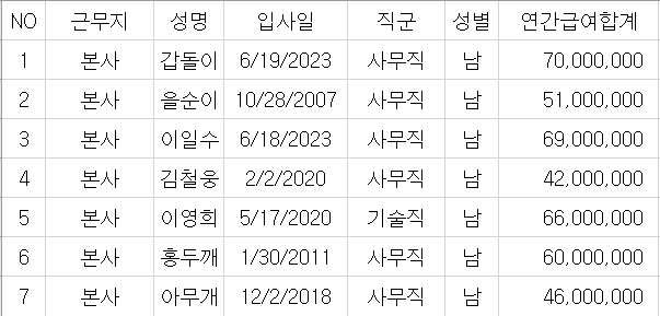 이번에 예제로 나룰 내용은 어느 회사의 직군별 성별 연봉 합계를 구하는 것이다.