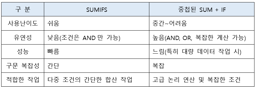 어찌보면, 중복함수 SUMIF가 SUMIFS와 별다르지 않은 것 같지만 둘 사이에는 차이가 있다. 둘 사이의 특징을 요약하여 비교하면 다음과 같다.
