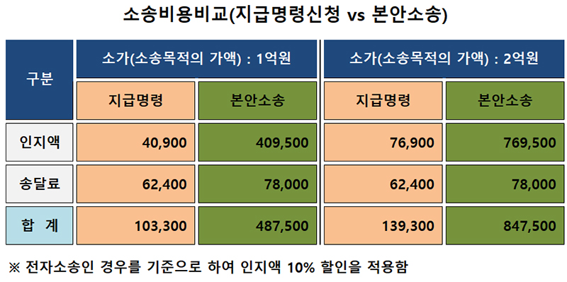 임대차계약의 경우는 다툼의 소지가 많지 않은 것이 일반적이라서 소송비용 중 인지액이 소송의 1/10 정도밖에 들어가지 않는 지급명령을 신청하는 것이 유리하다. 그럼에도 불구하고, 채무자(임대인)가 이에 대해서 다툴 내용이 있어서 지급명령에 대한 이의신청을 할 것이 예상된다면, 처음부터 본안소송으로 진행하는 것이 시간 낭비를 줄일 수 있다 {지급명령 신청의 경우, 채무자(이 경우에는 임대인)가 지급명령을 송달받은 날로부터 2주 이내에 이의 신청을 하게 되면, 본안소송으로 이송되기 때문에... 바로 본안소송을 제기했을 때보다 상대적으로 더 많은 시일이 소요될 수 있음, 본안소송으로 가게 되면 당연히 인지액의 차액도 보정(이 경우에는, 지급명령신청과 본안소송 사이의 인지액 차이만큼을 추가로 납부하는 것을 의미)을 하게 됨}.