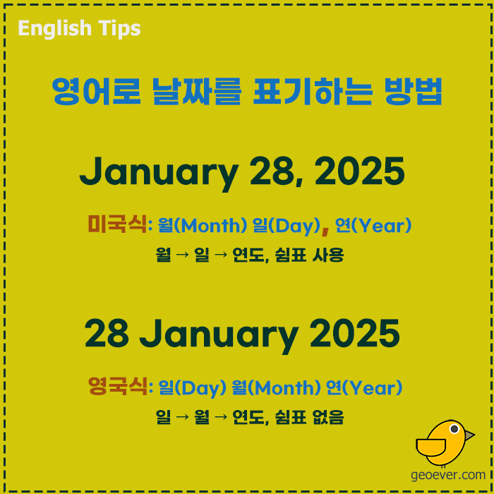 영국식은 '일(Day) 월(Month) 연(Year)' 순으로 쓴다. 중간에 콤마는 쓰지 않는다.