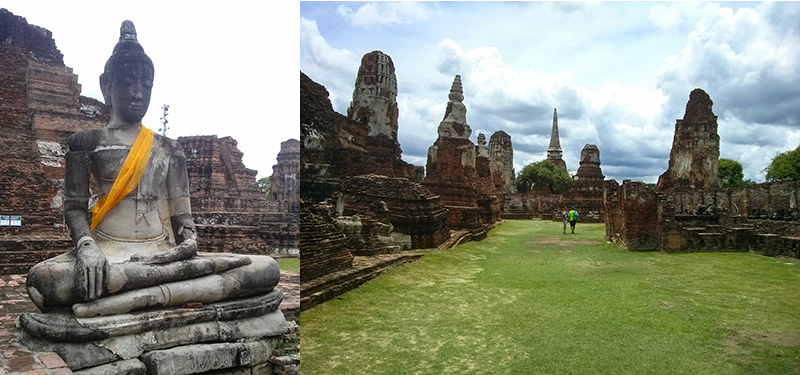 The palaces and temples of Ayutthaya, which were built around the 14th century, were destroyed after a war with Burma (Myanmar) in 1767, and were left as ruins. In this historical site, it is hard to find perfect shaped Buddha statues with heads and arms. And it made me feel deep sorrow about those sort of cruel wars.