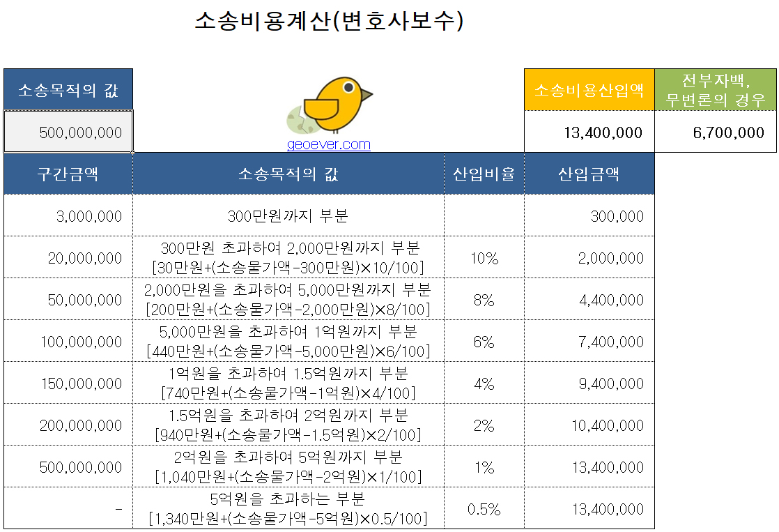 가상의 소송가액을 넣어가면서 실수가 없는지 확인해 보긴 했지만, 혹시라도 엑셀 수식을 적용하는 과정에서 오류가 있다면 널리 양해를 구합니다.