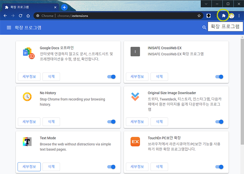 위의 이미지에서 우측 상단에 퍼즐 조각(zigsaw puzzle piece) 모양을 선택하면, '확장 프로그램'으로 연결된다.