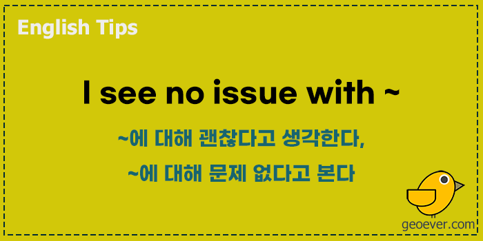 즉, I see no issue with~ 는 제안이나 계획에 동의할 때, 누군가 걱정하는 문제를 가볍게 넘길 때, 반대 의견 없이 허용하거나 수용할 때 등에 사용하면 적절한 표현이다.
