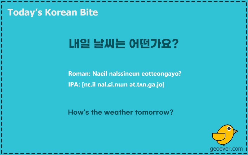 - 날씨는 (nal-ssi-neun): weather (with the topic particle 'neun' attached)